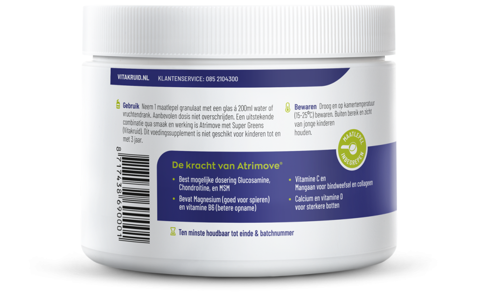 Atrimove® granulaat is een supplement in poedervorm. We verkopen dit poeder ook in capsulevorm, Atrimove® capsules. Het grote voordeel van granulaat ten opzichte van capsules is dat u slecht éénmaal per dag één maatschep hoeft in te nemen. Deze ene maatschep staat gelijk aan 10 capsules.