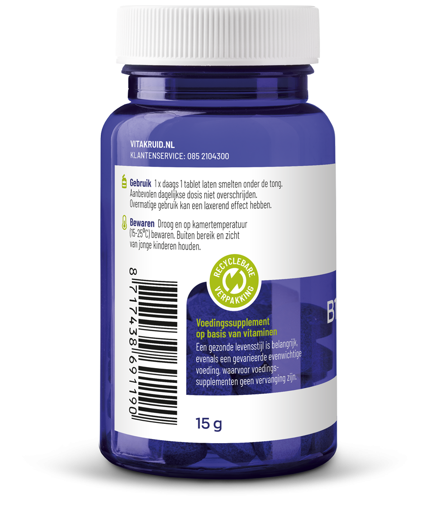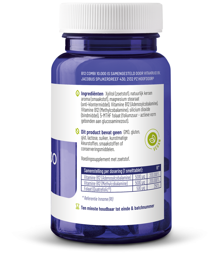 Wij bieden je de B12 Combi 10.000 aan in de vorm van een smelttablet. Opname via het mondslijmvlies zorgt voor een snelle en verbeterde opname van de werkzame nutriënten. Bovendien is de lichtzoete smaak van de B12 Combi 10.000 smelttablet zeer aangenaam!