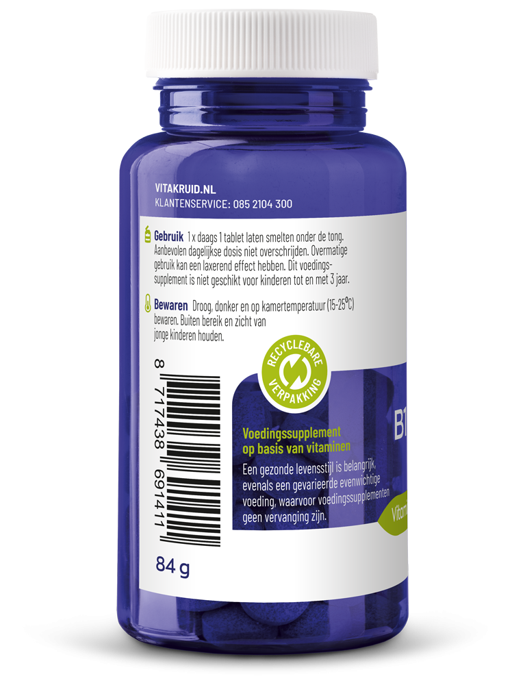 Een hoge dosering adenosyl- (3000 mcg) en methylcobalamine (3000 mcg) B12 combi, de kern van B12 Combi 6000 met folaat en P-5-P. Vitamine B12 heeft een wateroplosbaar karakter wat ervoor zorgt dat B12 supplementen geregeld de referentie inname ver overschrijden. Dit is volledig veilig! Er zijn daarnaast geen nadelige effecten in verband gebracht met een hoge B12 inname.1