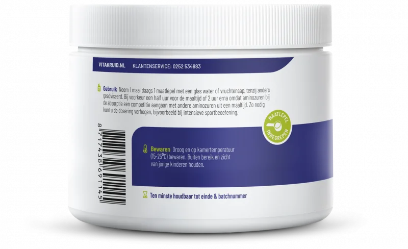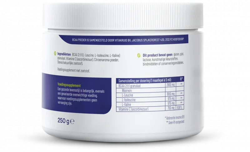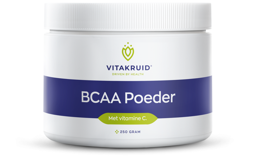Branched-Chain Amino Acids, oftewel BCAA’s in de volksmond, is een verzameling van de drie essentiele aminozuren l-leucine, l-isoleucine en l-valine. We noemen deze aminozuren essentieel, omdat we vertakte bouwstenen zelf niet kunnen aanmaken. We zijn dus afhankelijk van onze voeding voor een adequate BCAA inname. Idealiter zou onze aminozuurinname voor ongeveer 40% uit het hierboven genoemde trio moeten bestaan. Met name vlees, vis, eieren, zuivel, noten, zaden en bonen zijn hoogwaardige bronnen van BCAA’s. Omdat ons hedendaagse voedingspatroon nog wel eens te wensen overlaat, kan een hoog gedoseerd BCAA supplement uitkomst bieden. Het BCAA poeder van Vitakruid bevat maar liefst 1950 mg l-leucine, 975 mg l-isoleucine en 975 mg l-valine. De ideale aanvulling bij een aminozuurarm dieet!