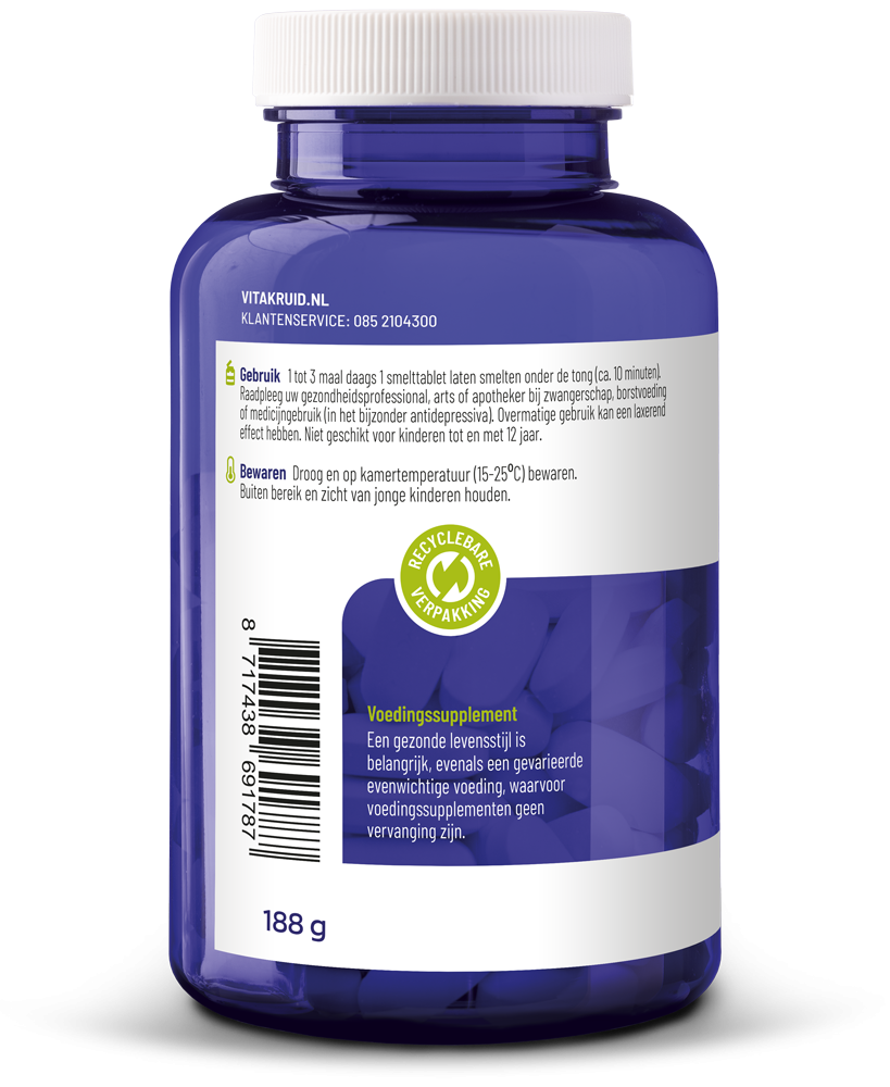 Voor een volledige opname van de nutriënten adviseren we het tablet minimaal 10 minuten onder de tong te plaatsen. Zo kunnen alle stoffen in de aangeboden hoeveelheid de bloedbaan bereiken. En geen zorgen, de natuurlijke aardbei-aroma maakt het tablet een feestje voor de smaakpapillen.