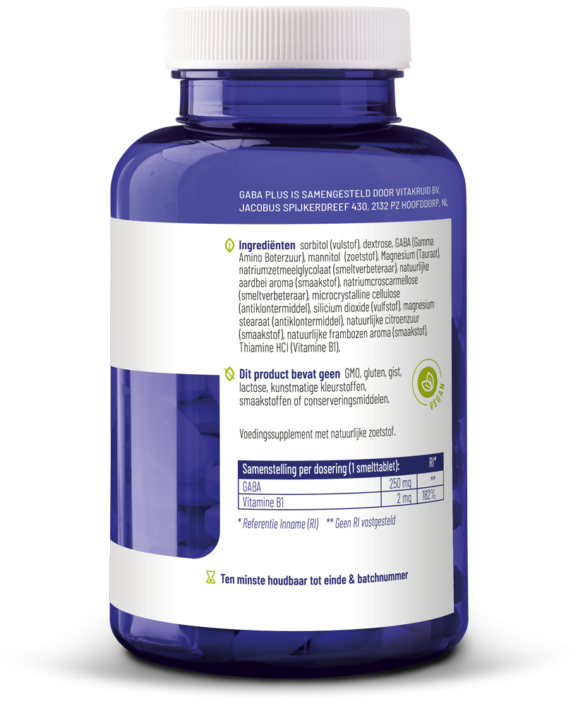 De manier van suppleren is allesbepalend voor de opname van GABA. Een GABA tablet of capsule van 500 mg of meer klinkt veelbelovend, maar de opname van GABA in tablet- of capsulevorm is ronduit matig. Uit onderzoekt blijkt namelijk dat de structuur van GABA te groot is om de darmwand te passeren. Zelfs gezonde darmen nemen het nutriënt niet goed op. Voor GABA Plus kozen we daarom voor een smelttablet. Door de keuze voor een zuigtablet volstaat een ogenschijnlijk lage dosering van 250 mg al!