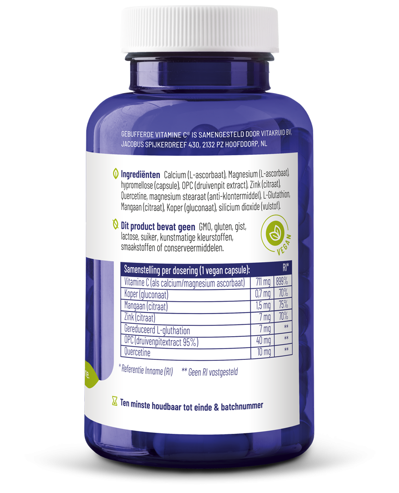 OPC (oligomere pro cyanidine) is een antioxidant die de dunne darm opneemt en vervolgens door het lichaam verspreidt.** Druivenpitextract we associëren met oxidatieve stress en de ondersteuning van hart- en bloedvaten.** Door zijn vele gezondheidsbevorderende effecten wordt OPC vaak als los supplement ingezet. In onze formule is eenzelfde hoeveelheid als in dergelijke preparaten aanwezig voor een gunstigere prijs. De voornaamste reden dat we dit druivenpitextract in de Gebufferde Vitamine C hebben opgenomen is zijn vermogen om de werking van andere nutriënten in de formule te versterken.8,9,19
