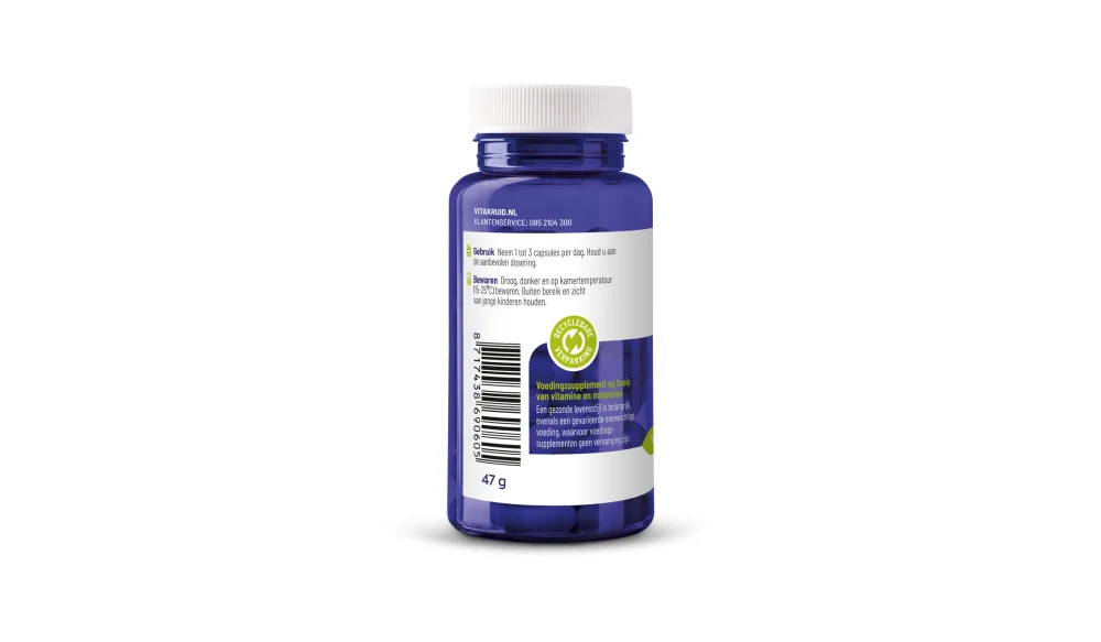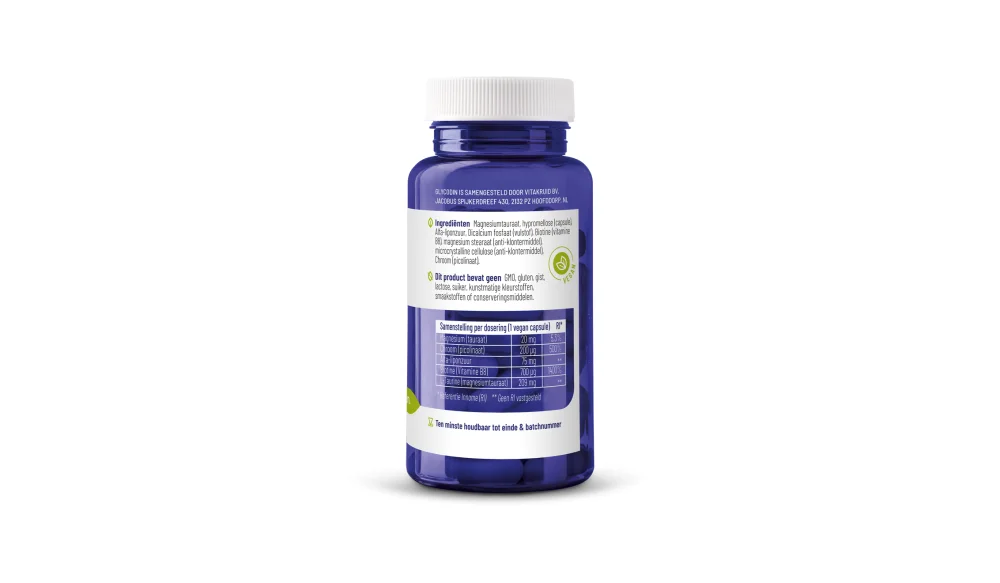 Een verstoorde glucosebalans heeft namelijk talloze negatieve gezondheidseffecten. De complexformule Glycodin voorziet per capsule in een royale hoeveelheid van 200 mcg chroom picolinaat (III), 250 mcg biologisch actief magnesiumtauraat, 700 mcg van de energieleverancier biotine (b8) en 75 mcg van het endogene vetzuur alfa-liponzuur. Een uitgebalanceerde formule speciaal gericht op het behoud van een natuurlijke bloedsuikerspiegel*