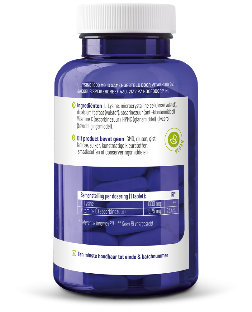 Naast de kwaliteit van het nutriënt is natuurlijk ook de dosering van belang. Een hogere dosering zorgt gewoonweg voor meer werkzame stoffen en dus voor meer effect. De meeste l-lysine supplementen bevatten tussen de 250 en 500 mg per tablet. Uit onderzoek blijkt dat deze doseringen te laag zijn voor een toereikend effect. Daarom bevat onze L-Lysine 1000 maar liefst 1000 mg extract per tablet en adviseren we tot twee tabletten per dag te nemen; een onderbouwde dosering!