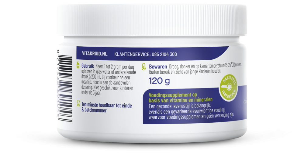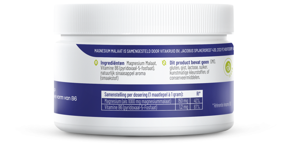 Vitamine B6 zorgt voor een verbeterde opname van magnesium. Daarnaast heeft de vitamine vele wetenschappelijk onderbouwde gezondheidsbevorderende effecten voor het lichaam. Zo is B6 onder andere goed voor de aanmaak van rode bloedcellen, de eiwitproductie en cysteïne aanmaak*. Pyridoxaal-5-fosfaat (de biologisch actieve, co-enzymatische vorm van vitamine B6) heeft een betere biologische beschikbaarheid en is veiliger dan pyridoxine HCL. Vitakruid heeft in de Magnesium Tauraat en de Magnesium Malaat uitsluitend gebruik gemaakt van de vorm P-5-P.