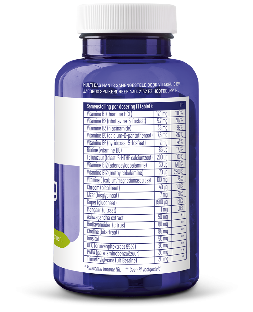 De Multi Dag Man bevat alle B-vitaminen. Deze natuurlijke energieleveranciers hebben we uitsluitend in hoge en veilige doseringen toegevoegd*. Verder kiezen we voor biologisch beschikbare vormen, die het lichaam goed opneemt. Hierdoor kan je de Multi Dag Man ook gebruiken als actief B-complex!