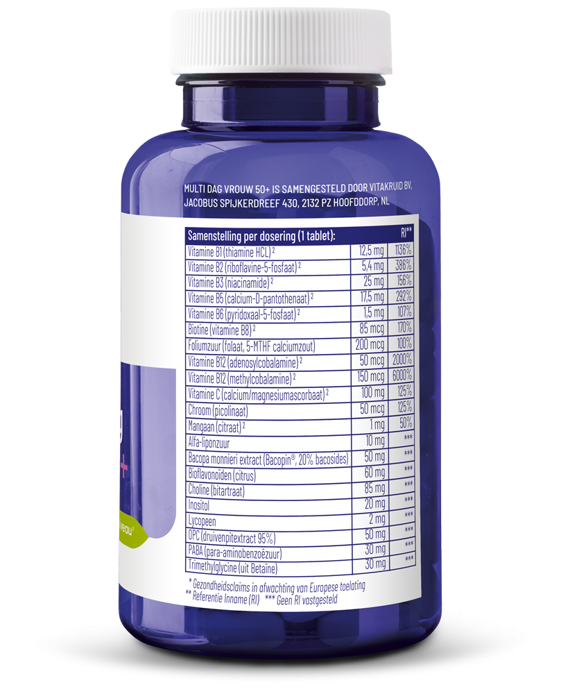 Ook na je 50e wil je het beste uit jezelf halen. Maar bij het ouder worden heeft je lichaam overdag behoefte aan andere voedingsstoffen dan in je jongere jaren. Iets waar bij de ontwikkeling van de Multi Dag Vrouw 50+ rekening mee gehouden is. De formule bevat bijvoorbeeld geen ijzer en koper aangezien je hier als 50-plusser minder van nodig hebt. Daarnaast is er gekozen voor hogere doseringen vitamine B12 en choline.