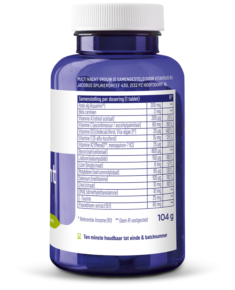 ’s Nachts willen we vooral ondersteund worden in ons herstel. Dit vereist totaal andere nutriënten dan een formule voor ondersteuning van energie en concentratie. We zijn de enige aanbieder van voedingssupplementen die rekening houdt met het bioritme. En daarom bevat de Multi Nacht Vrouw onder andere vitamine D, voor de opbouw van sterke botten en vitamine A, voor het herstellend vermogen van de huid*. Een innovatieve formule speciaal gericht op de nacht!