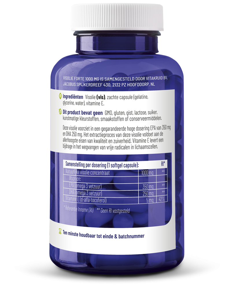 De Visolie Forte van Vitakruid bevat 1000 mg visolieconcentraat per capsule, waarvan 350 mg EPA en 250 mg DHA. Een formulering die de dagelijkse minimale aanbevolen hoeveelheden volgens verschillende landen ruimschoots haalt.